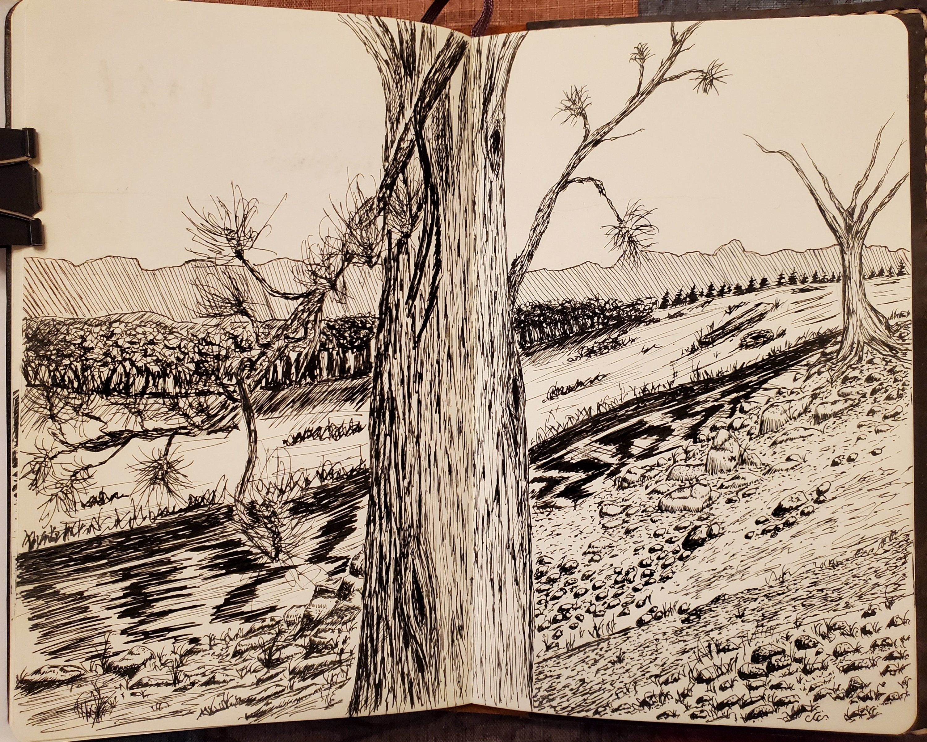…Since writing that I have managed to get some time in sketching. I’ll just post them below. They were done with fountain pen in my Moleskein sketchbook.
